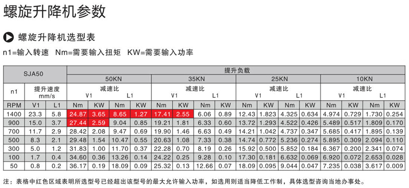 螺旋升降机正常工作状态下的输入功率不能超过最大输入功率,输入功率kw=(满载扭矩Nm x负载率x输入转速rpm )/ 9550m,