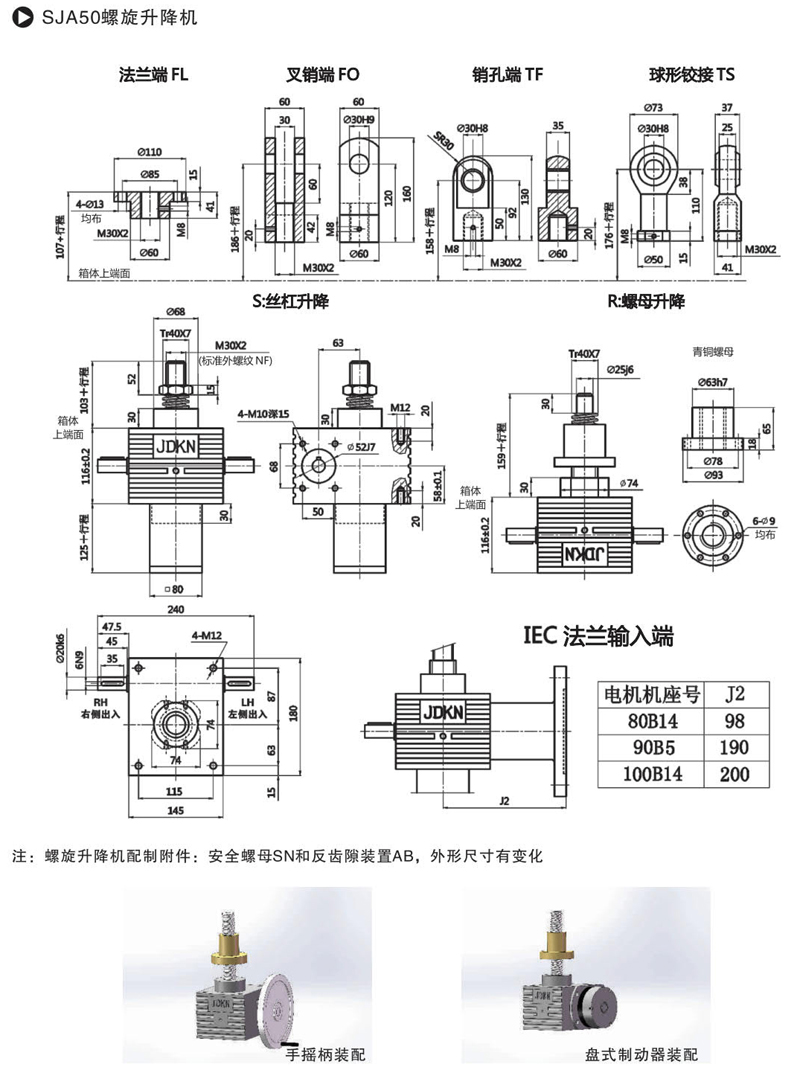 SJA螺旋升降机又称SJA丝杠升降机,本产品是一种超重部件,可起升、下降及借助附件实现推进、翻转及各种高度位置调整等功能。结构及装配形式可选,可按客户要求定制,安装方便、使用灵活、功能多、配套及形式多、可靠性好、使用寿命长等优点。