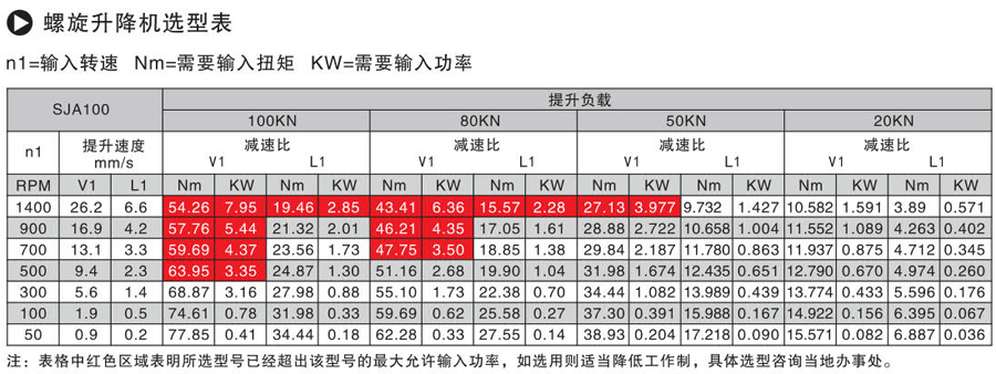 螺旋升降机正常工作状态下的输入功率不能超过最大输入功率,输入功率kw=(满载扭矩Nm x负载率x输入转速rpm )/ 9550m,